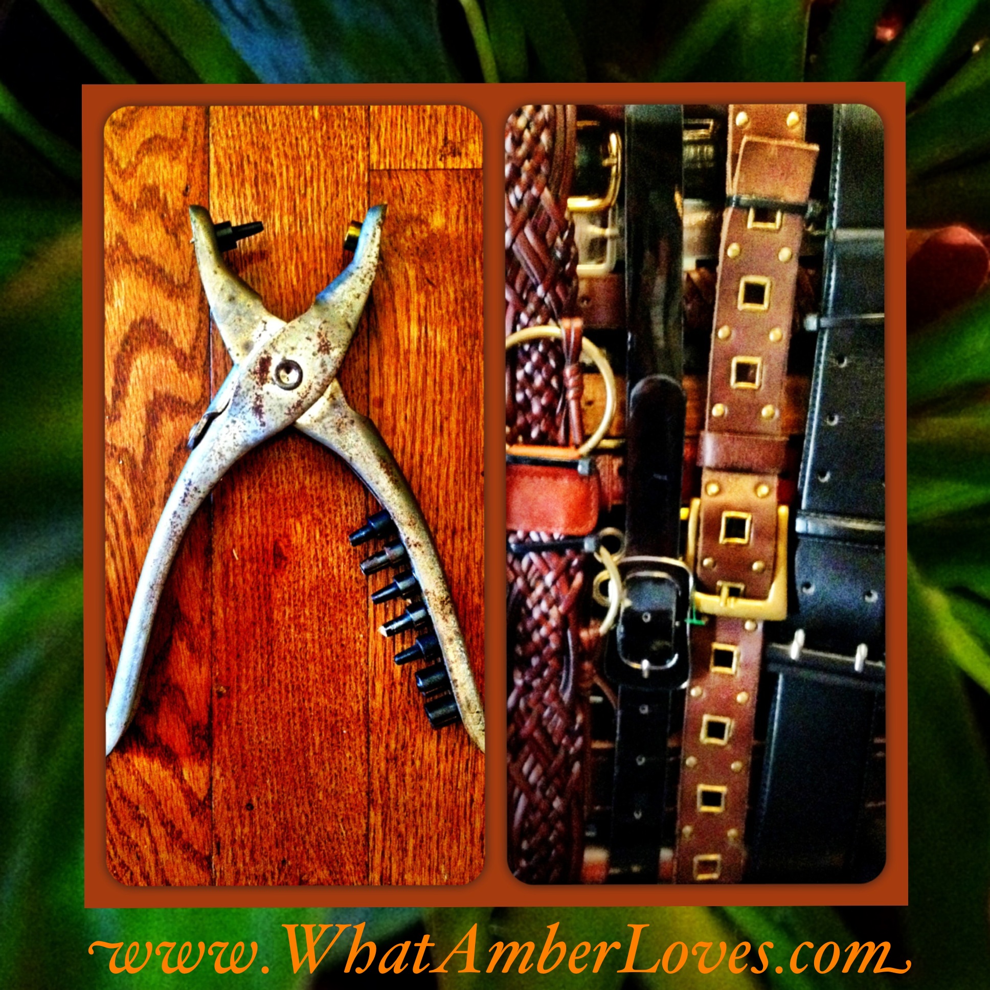 Now, it is important to note that not all belts will fit perfectly. The easiest belts to work with were the ones that had holes, grommets, or weave that ran the full length of the belt. These belts are my favorite. In the future, if I ever do decide to re-weave the chair with traditional materials, these belts will be able to return to their original use as belts, unaltered! But, for the ones that didn’t fit, it was really easy to just use a hole-punching tool to add a hole where you need it. If you don’t have a punch tool like the one I’ve pictured, I’m pretty sure that you could just hammer a nail through the belt atop a piece of wood in order to make your hole.