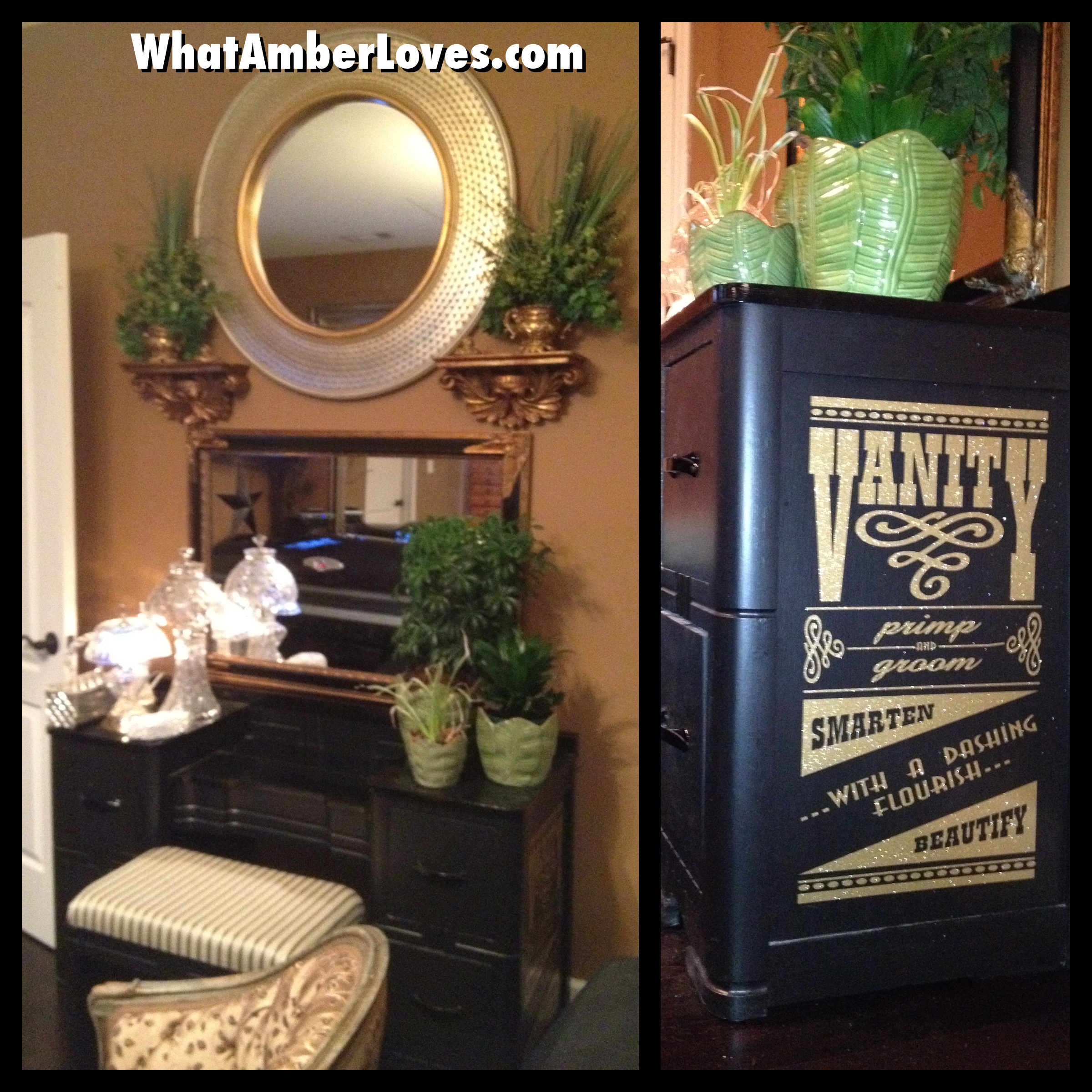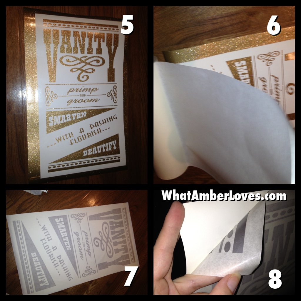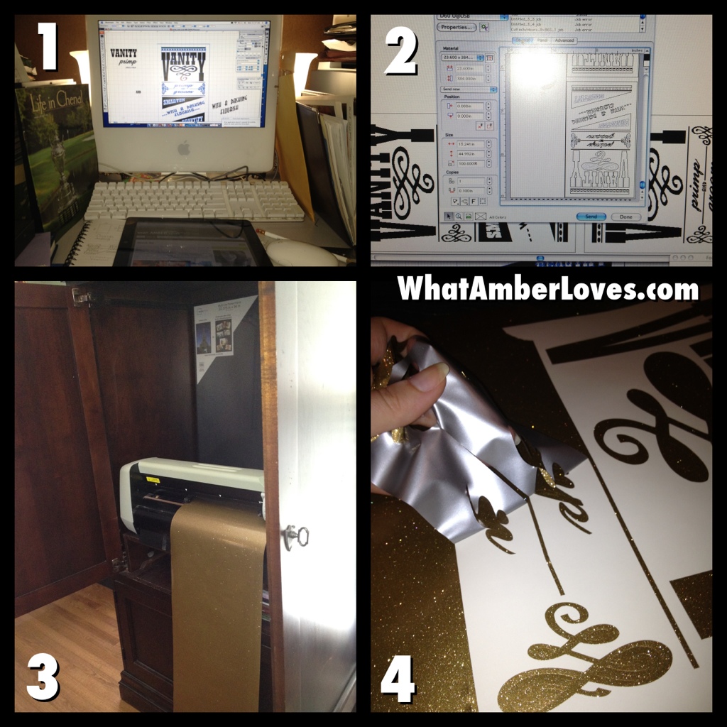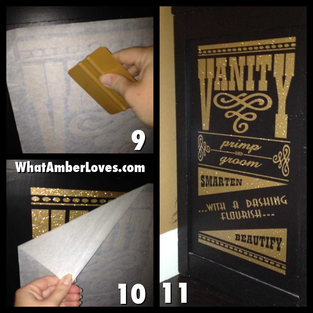 I laid out the mirrors and empty frames on the floor to arrange them. I snapped a pic of the arrangement on my phone. Then, I just started hanging them on the wall while referring to my pic. For the frames that overlap on top, we just used our finish nail gun (tiny, small nails shot through the pneumatic nail gun via portable air compressor) to nail them together as inconspicuously as possible. Finally, to tie it all together, I’ve added a few quotes that were cut using my sign machine. For a complete tutorial on how to install vinyl sign graphics, check out my tutorial for installing graphics on furniture.