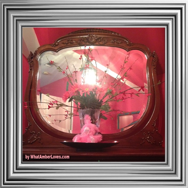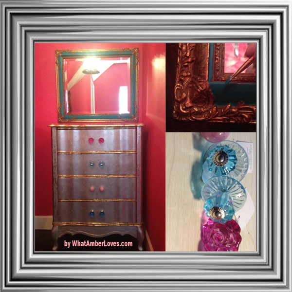 So, here is the fun silver chest that I mentioned. It is a gift from my grandmother. It has been in the family for a long time, but had been in storage for many years which ruined most of its original pale colored wooden finish. Awhile back, I coated the whole thing in silver rub’n’buff and gold leaf. (everything but the top surface.) Yes, really; all silver and gold!! Haha! Even though the package of craft product is labeled “Gold Leaf” in bold letters, it is in fact a metal leaf, not “GOLD,” as would be defined by a scientific periodic table of elements! As for the Rub’n’Buf, I don’t know whether there are any precious metals in there or not, but it is pretty! It is so easy to use! Just like the product says, I just rubbed the product onto the surface of the chest with a scrap of a old tshirt and buffed with another scrap; rub’n’buff. (Gold leaf: glue-ish medium known as sizing + leaf transferred using wax paper + spray sealer.) To personalize the chest for our daughter’s new room, we added a mix of new glass knobs in shades of pink and teal. (found them on sale at Hobby Lobby) And, I repainted an old framed mirror to coordinate. She LOVES the set! YAY!!