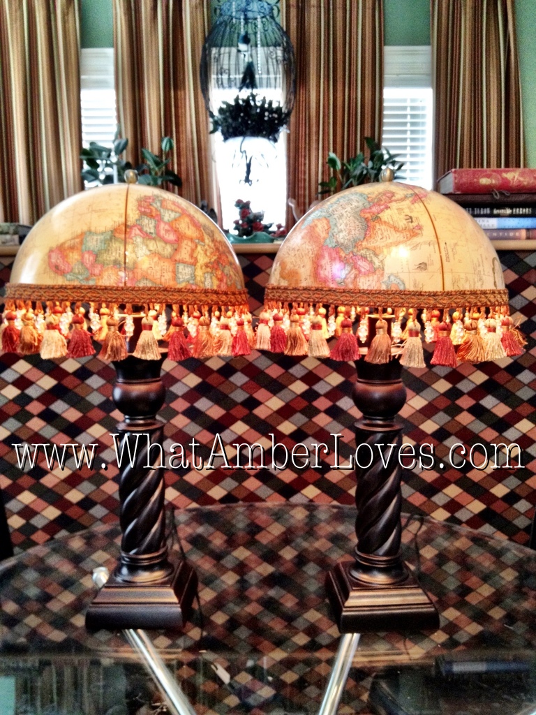 The easier way to split the globe would have been to just remove the tape along the equator, but then one globe would be rightside up and the other would be upside down. That wouldn’t do! I wanted a pair!! So, using a jigsaw, my husband Mitch cut it along one of the lines of longitude for me! 🙂 Now, I have a pair that are BOTH sideways. Both. That makes me happy. Next, we just drilled a hole in the top, so that it slides on easily and is held in place between the lamp’s harp and finial. Glue on trim. Insert low wattage bulb. Important: very low wattage bulb, because this is a cardboard shade. Done! (click on photos to enlarge them)
