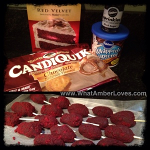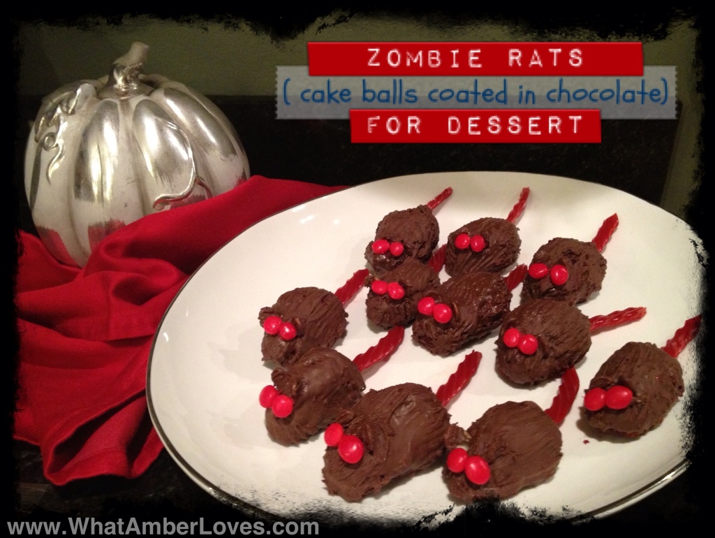 The “zombie rats” are actually red velvet cake balls coated in a hard chocolate shell! They have almond slivers for ears, red hot candy eyes, and candy tails!