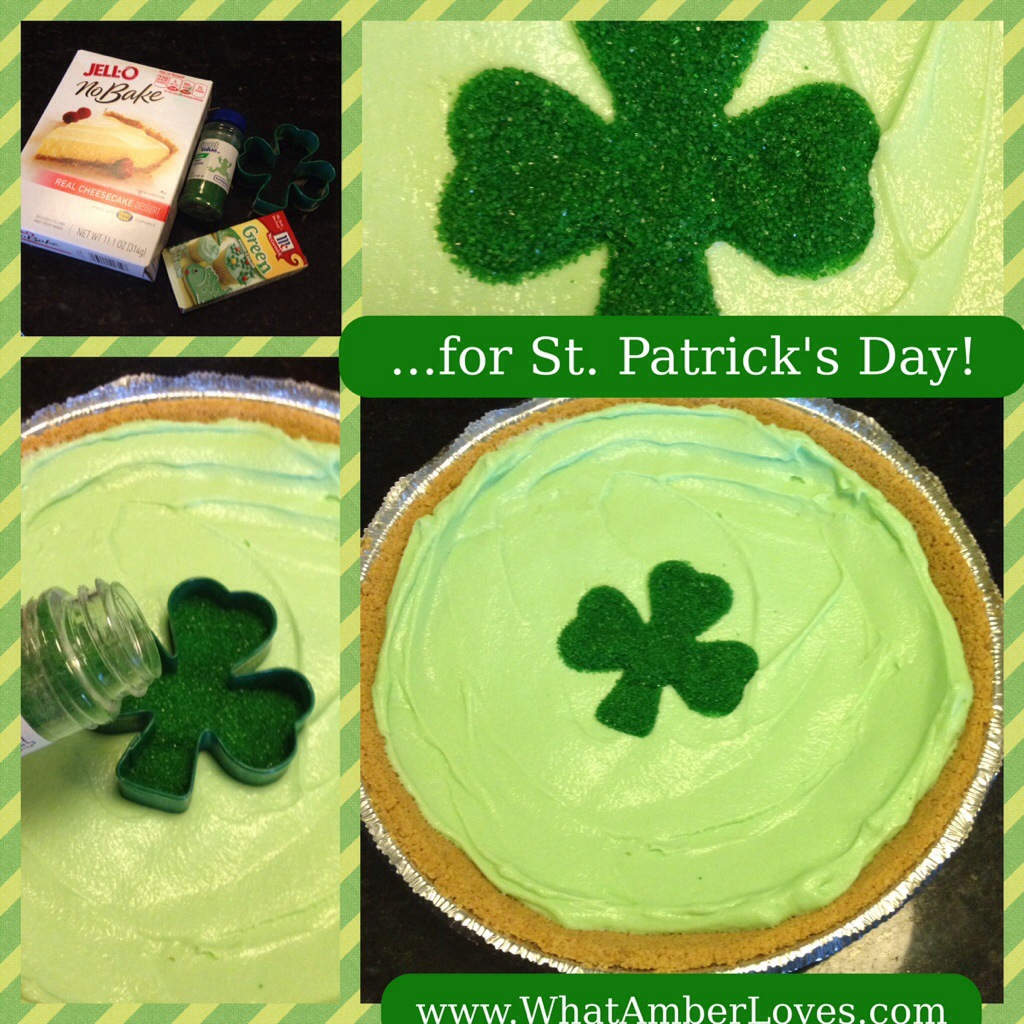 We used a cookie cutter as template/border for pouring our sprinkles onto our St. Patrick’s Day pie! It’s a Jello brand no bake cheesecake that we tinted green with food coloring! Yummy!