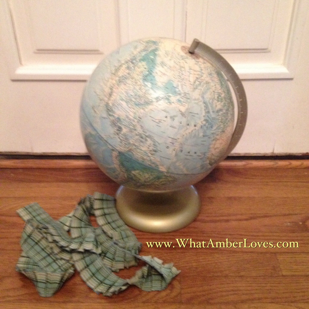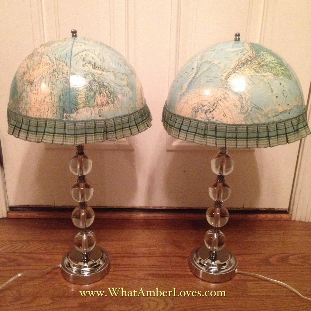 Just saw the globe in half. Use a hot glue gun to adhere trim/fringe. Drill a hole in the top, so that it secures between your lamp harp and finial.