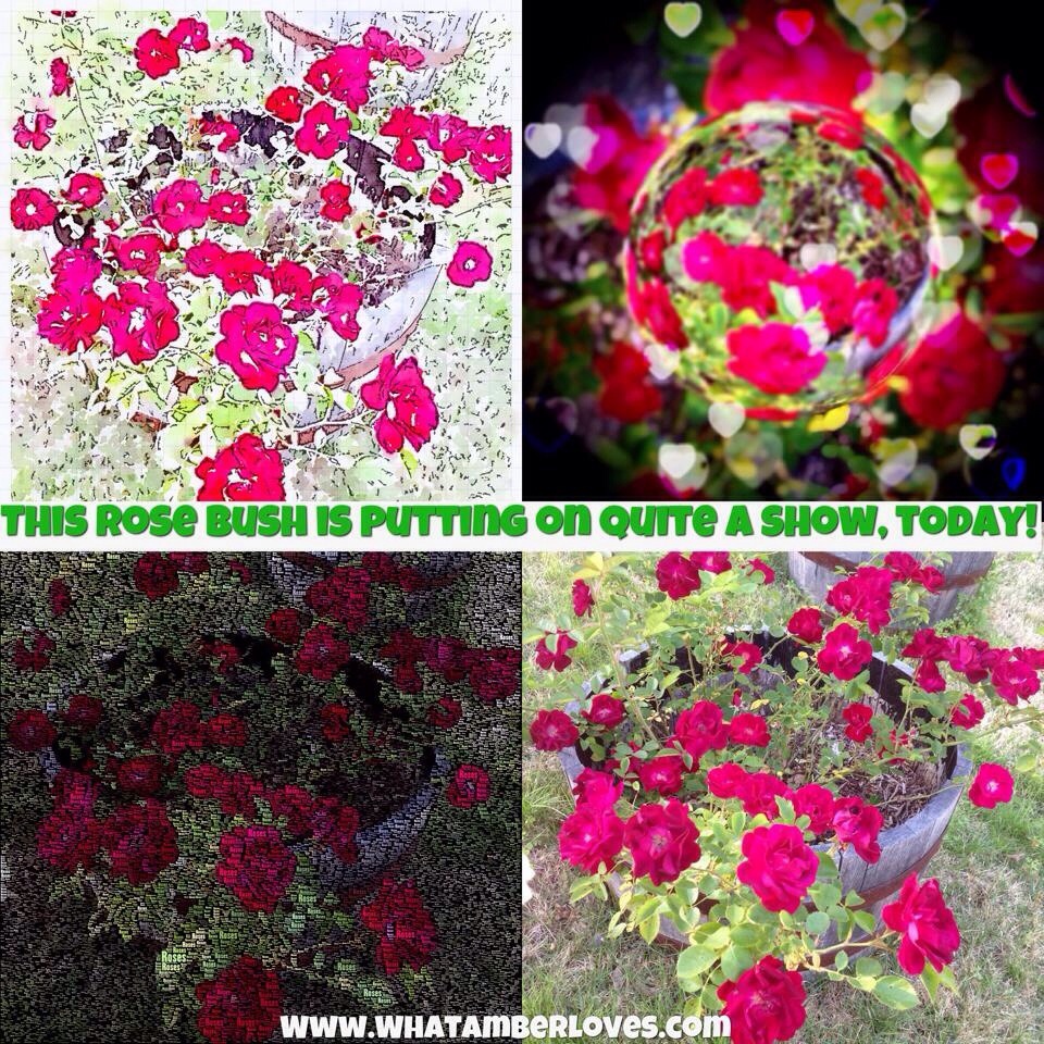 The roses had been thriving in their whiskey barrel pots, except for one. It had beautiful foliage for the last three years, but never bloomed. Then, this year… WOW! It suddenly decided to put on quite a show! See the roses from Betty are a miniature pink one that reminds me of Great, Great Aunt Ruby’s, a yellow one, a carnival one that changes from yellow to an orangish-pink, and the fourth was a mystery. Well, mystery solved. It’s a gorgeous deep dark pink that borders on being red. It’s magnificent!