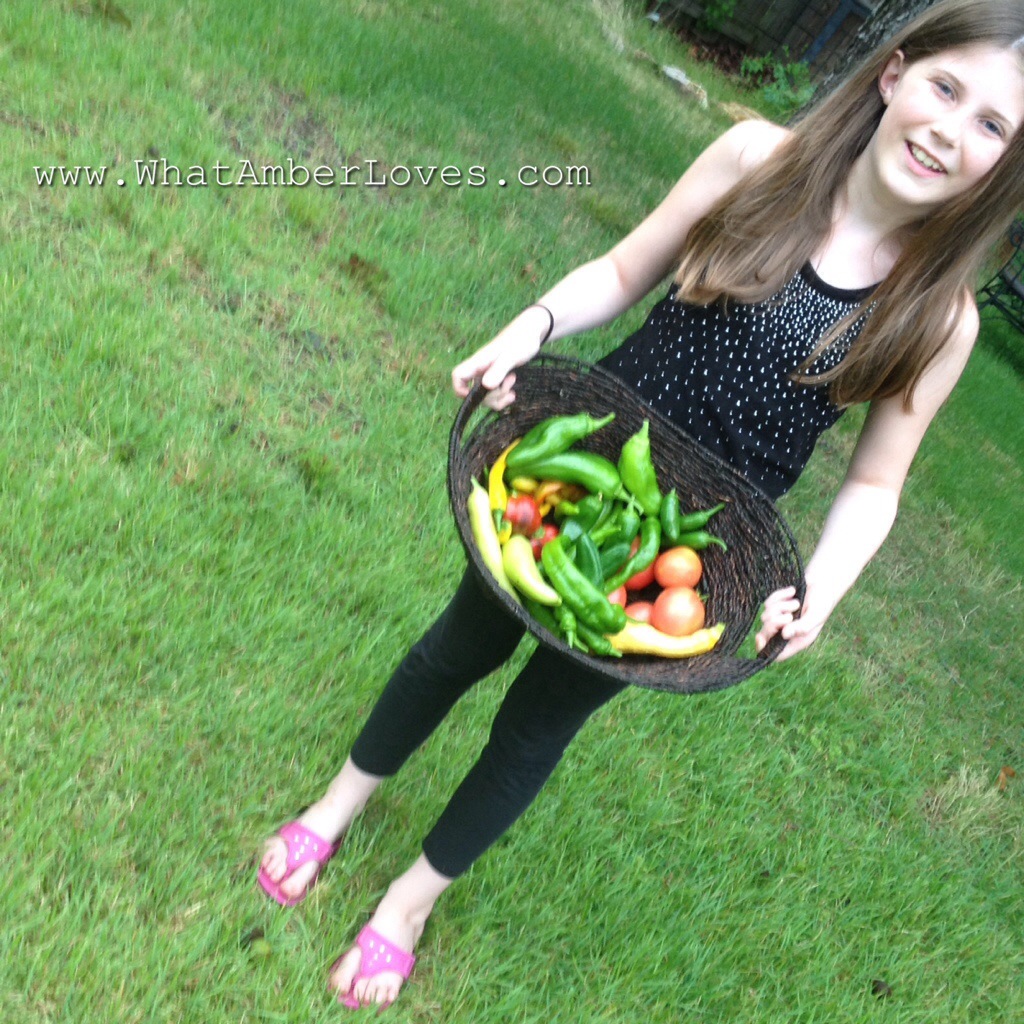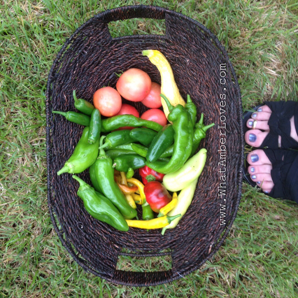 We’ve had short splashes of rain everyday this week, at just the right times, my garden thinks. Just yesterday, the kids spent time in our backyard playing, swinging on the tire, flipping on the monkey bars, jumping on the trampoline in the upper part of the yard out in the hot, humidity all afternoon. The air was so thick, you could almost cut it with a knife. Then, right as they came inside for dinner, we had a wonderful hour long downpour, ending about an hour before sunset. This left us the perfect window of time to pull a few weeds and harvest a basket of tomatoes, peppers, and yellow squash.