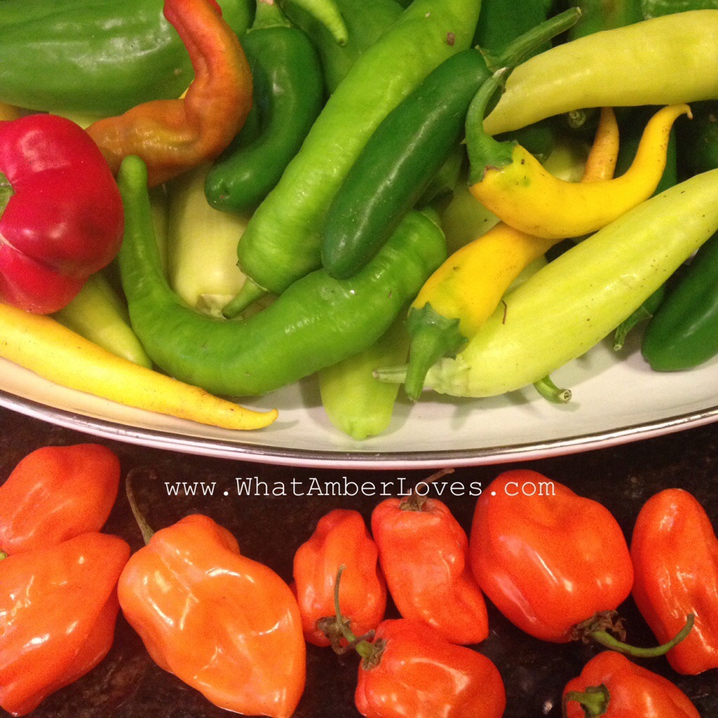 The white platter is holding the peppers I’ve picked from our garden the last three days. I also purchased a few little orange colored habenero peppers from the grocery store to make our blend have extra heat for our winter chili! Love.