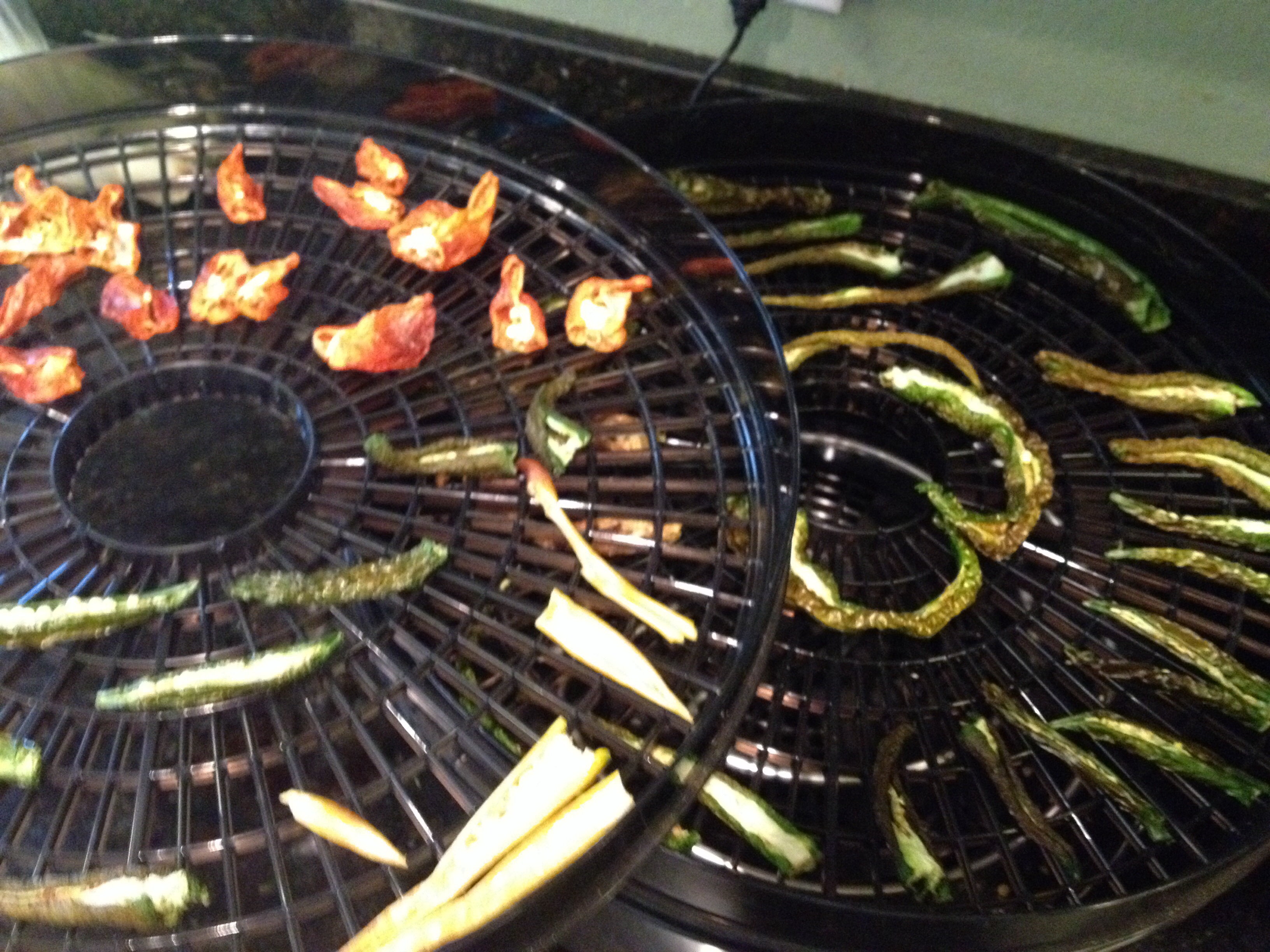So far, we’ve simply cut the peppers in half lengthwise and placed in the dehydrator (skin side down.)