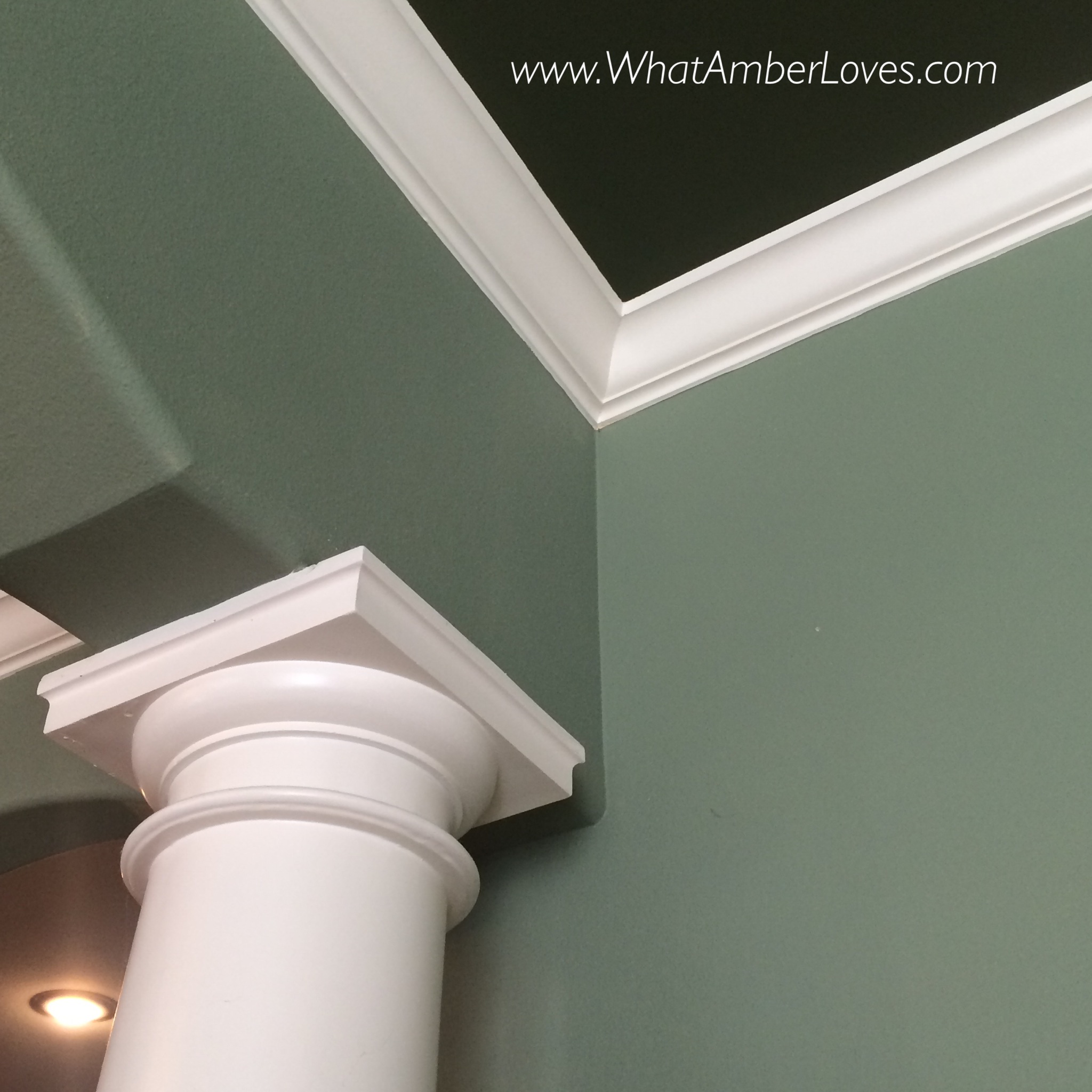 5) We also decided to paint the ceilings in the foyer, living room, and office a dark green! It doesn’t darken the room, but it does make the 10′ ceilings seem even higher! The Living Room has windows that are almost floor to ceiling spanning one wall, lights in the ceiling fan, and a pair of wall sconces, so it is sufficiently bright! Here it is: