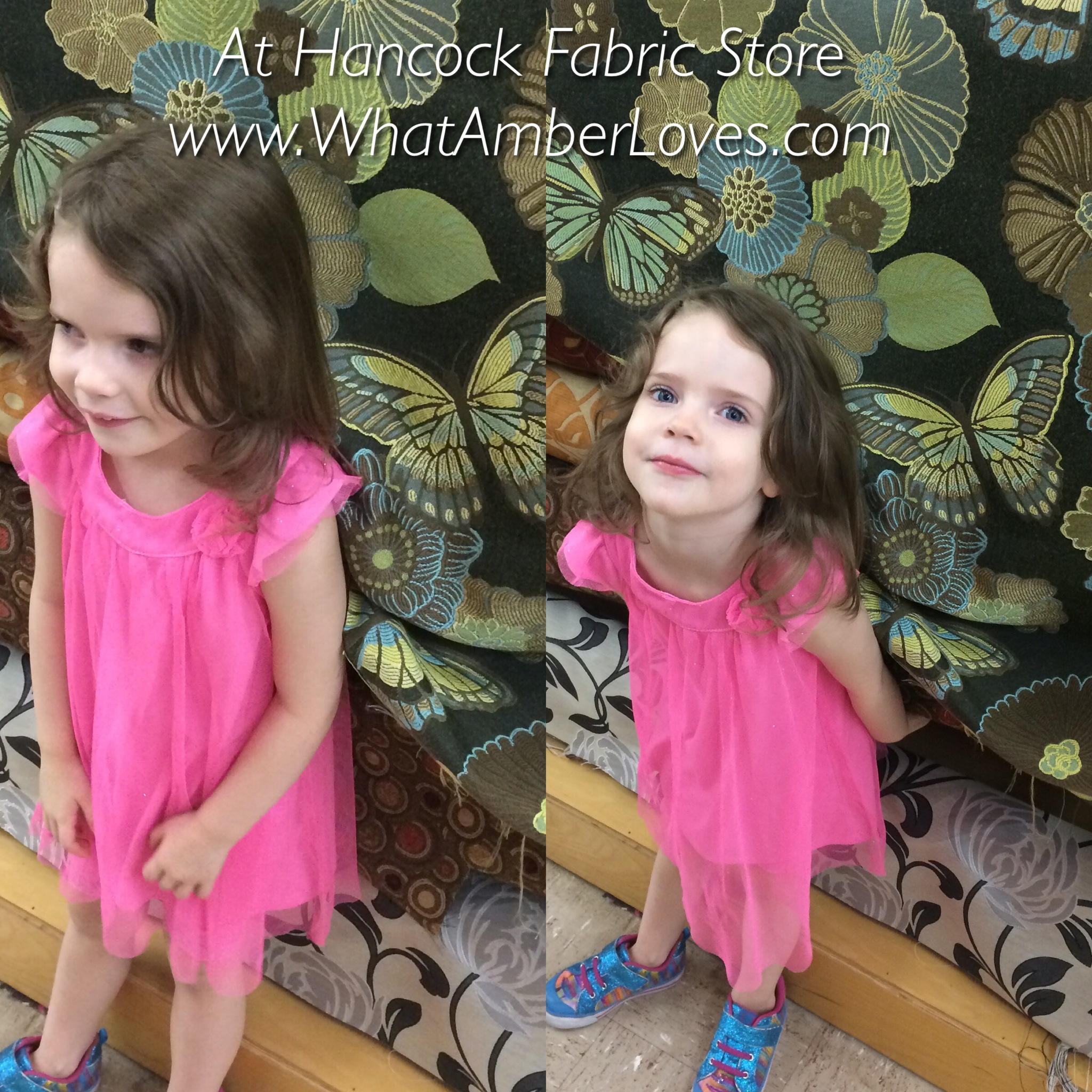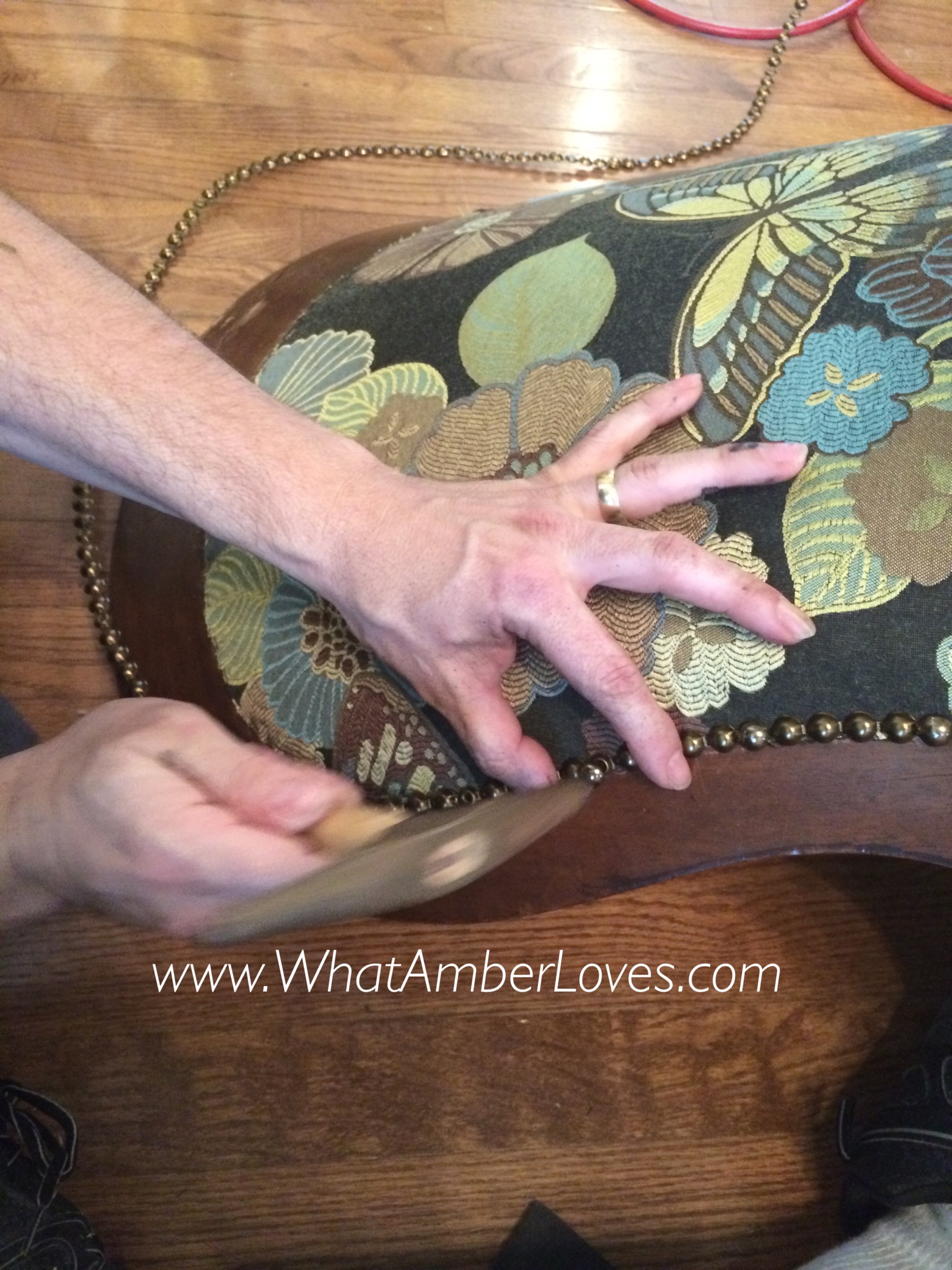 7) What else? Oh, yeah! We reupholstered another chair! I asked Baby Veronica to me find something green in Hancock Fabric Store, and she picked this green butterfly upholstery fabric, so we went with green butterfly fabric for the chair that sits in the foyer. It’s kind of an entry way into the library. We also covered the desk shroud! See: