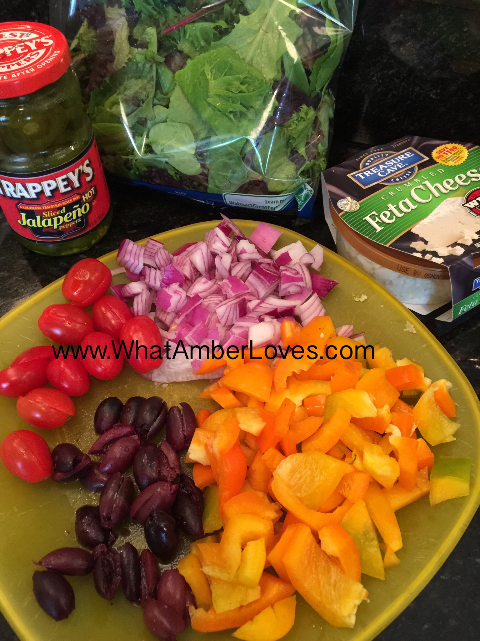 Add your Greek toppings. (I used a bit of spring lettuces, red onion, orange bell pepper, kalamata olives, and ArkansasGrown cherry tomatoes, feta, and a bit more mozzarella.)