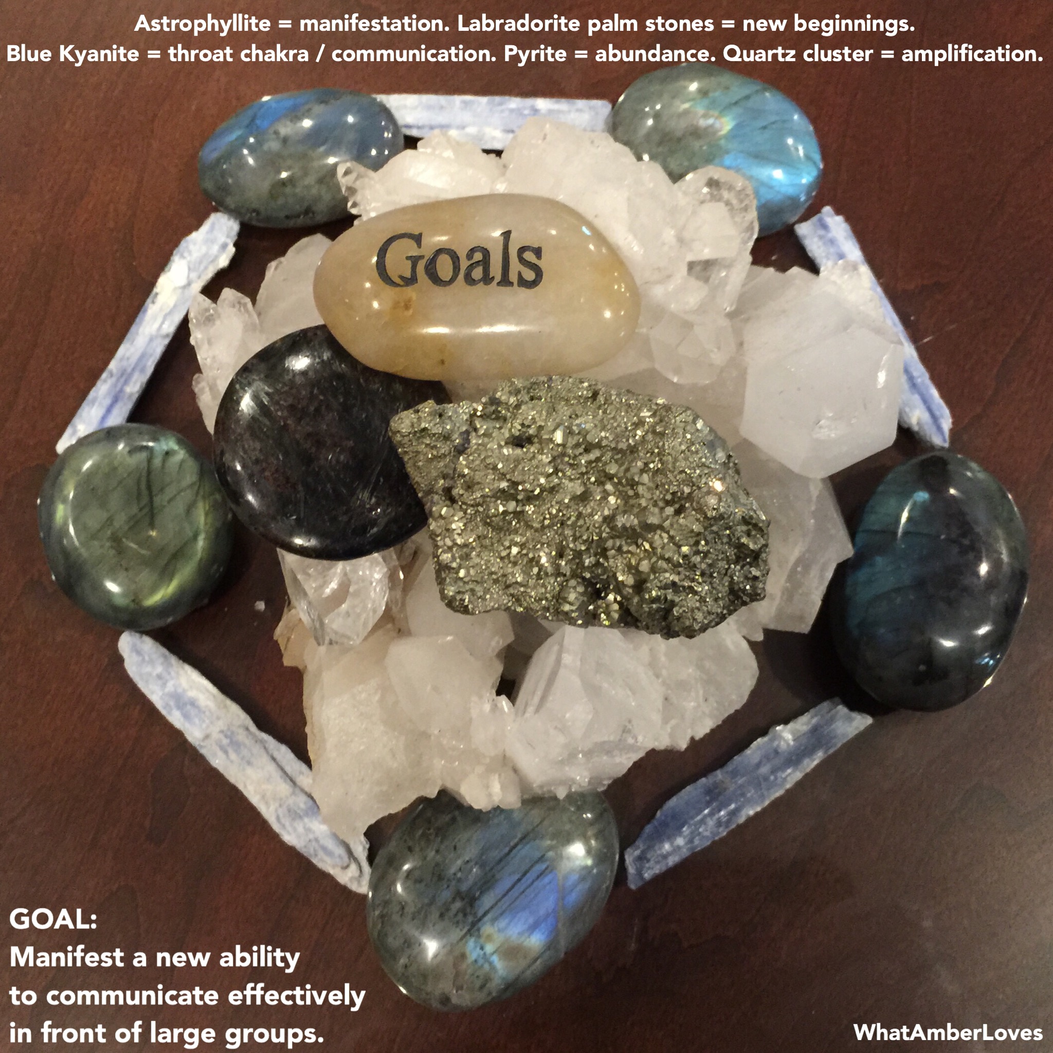 GOAL: Manifest a new ability to communicate effectively in front of large groups. (Labradorite palm stones = new beginnings. Blue Kyanite = throat chakra / communication. Pyrite = abundance. Quartz cluster = amplification. Astrophyllite = manifestation.)
