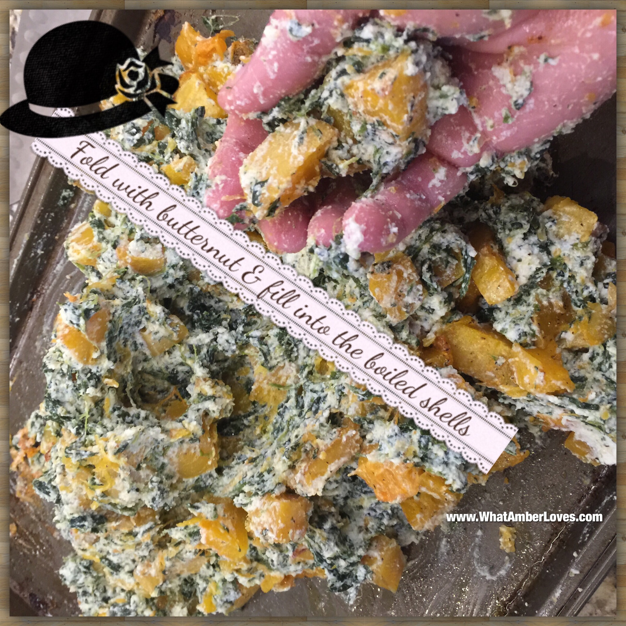 1) Peel, chop and toss in olive oil your butternut squash, then in a hot oven roast at 425 degrees fahrenheit for 20-25 minutes. Cook your jumbo pasta shells according to directions. Steam your spinach according to directions.