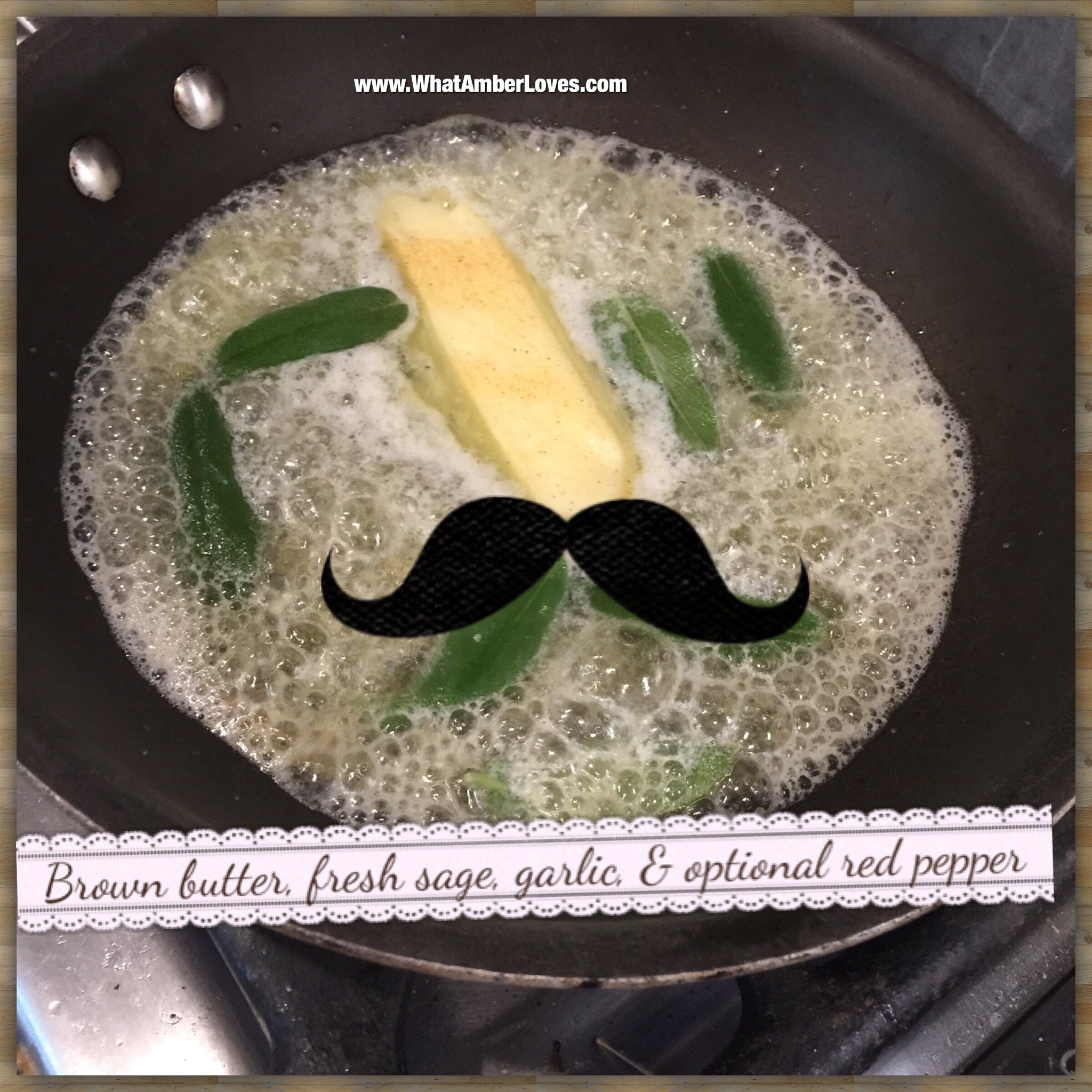 4) While it bakes, make a sage brown butter sauce by melting 1 stick of butter in a saute pan until golden brown and bubbly. Add at least 10 sage leaves until slightly crisp, garlic powder, & crushed red pepper flakes. Turn off heat and squeeze in fresh lemon juice. When it finishes baking and cheese is melty, spoon your warm sage sauce all over and sprinkle with grated Parmesan. Enjoy!