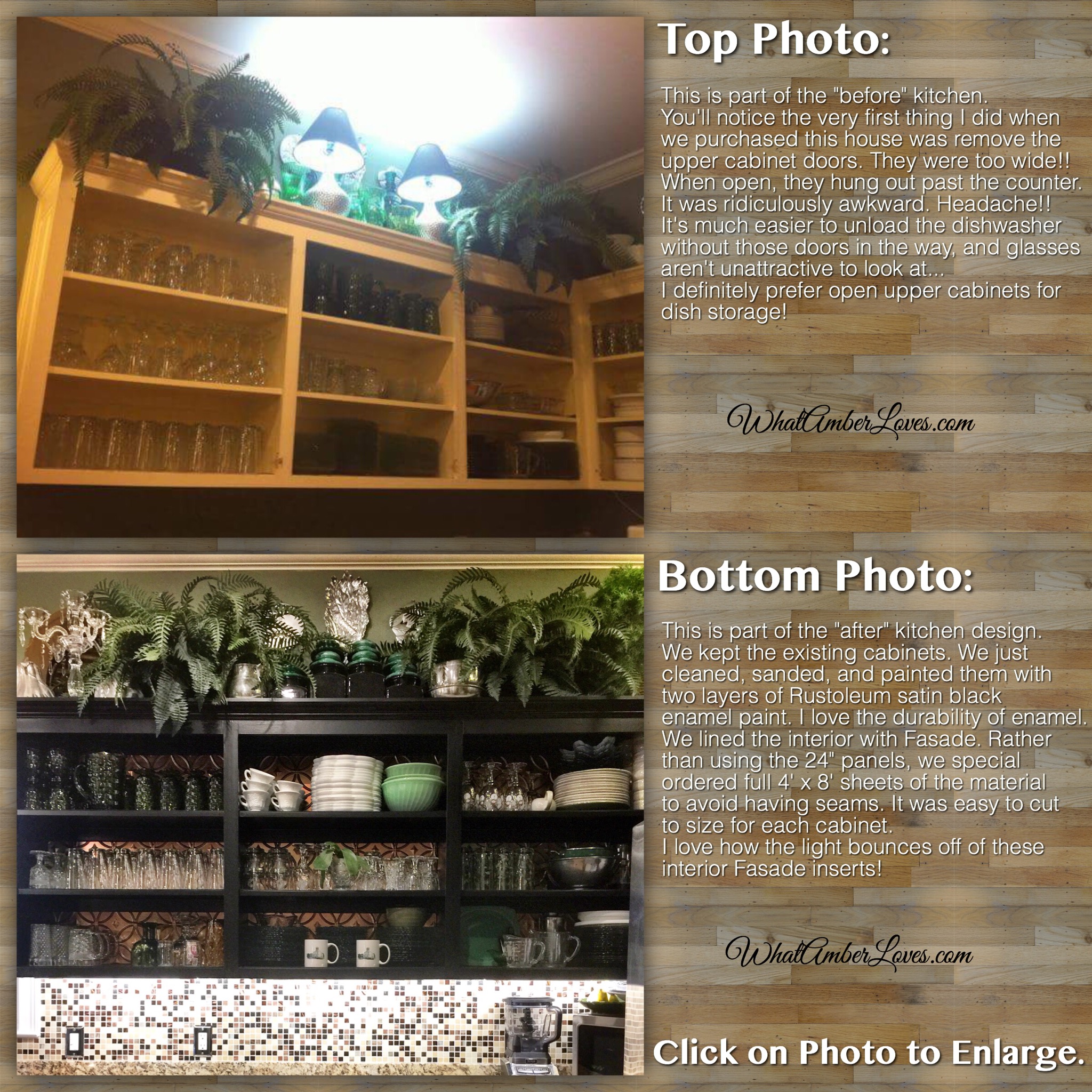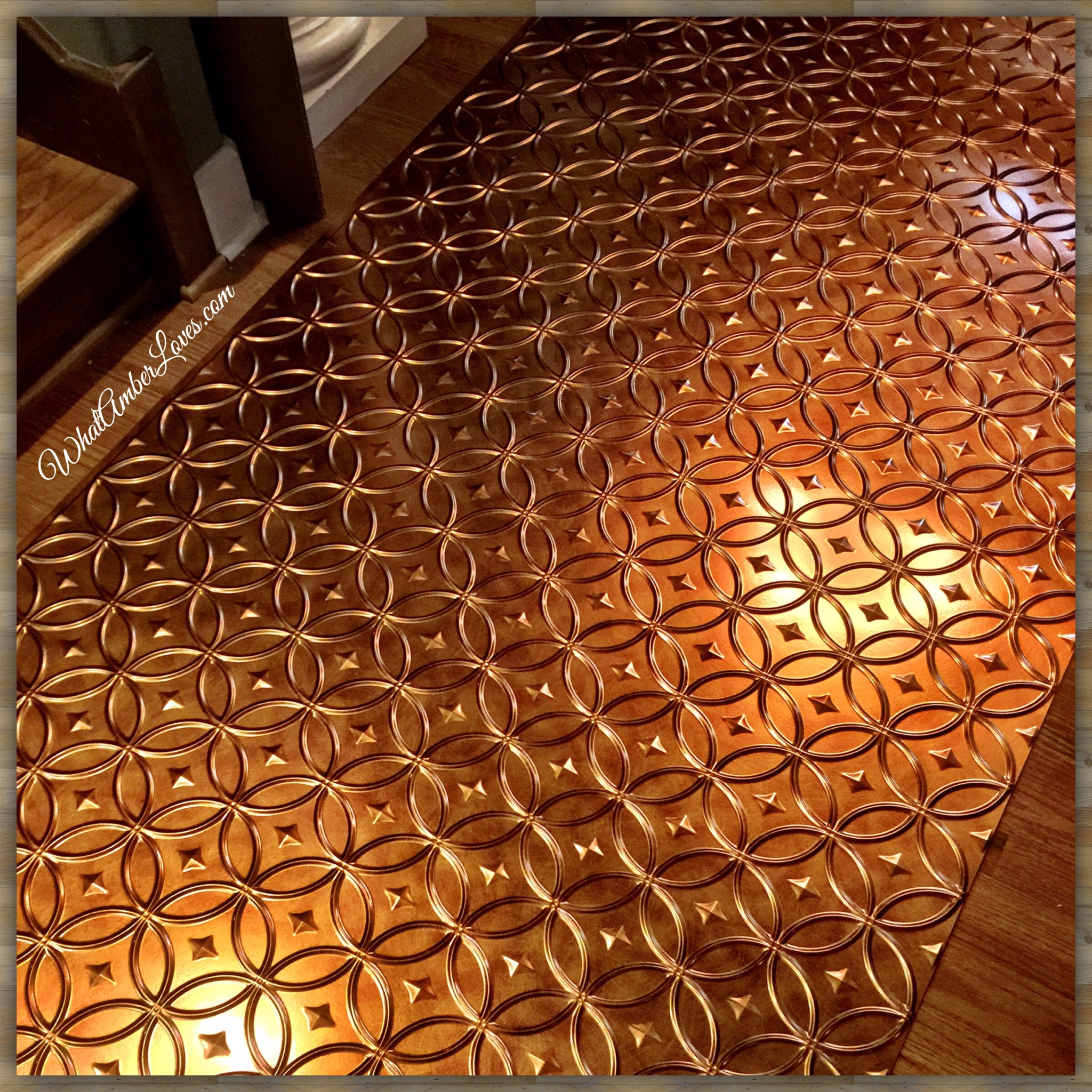 We purchased 4′ x 8′ sheets of a thermoplastic material in an antique bronze finish (looks Copper to me,) and then we cut the pieces to fit each cabinet! Easy!