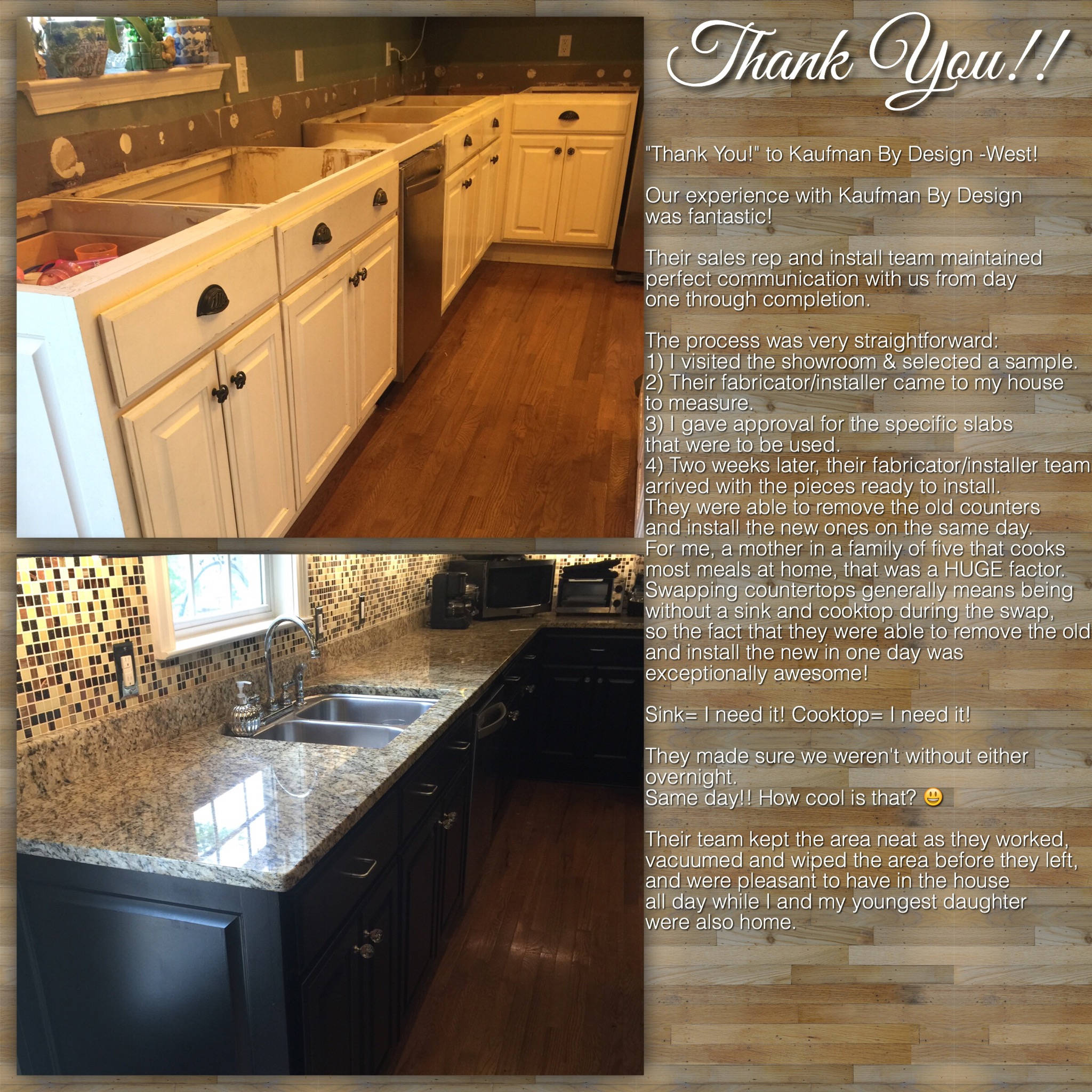 4) Two weeks later, their fabricator/installer team arrived with the pieces ready to install. They were able to remove the old counters and install the new ones on the same day. For me, a mother in a family of five that cooks most meals at home, that was a HUGE factor. Swapping countertops generally means being without a sink and cooktop during the swap, so the fact that they were able to remove the old and install the new in one day was exceptionally awesome! Sink= I need it! Cooktop= I need it! They made sure we weren’t without either overnight. Same day!! How cool is that? π Their team kept the area neat as they worked, vacuumed and wiped the area before they left, and were pleasant to have in the house all day while I and my youngest daughter were also home.
