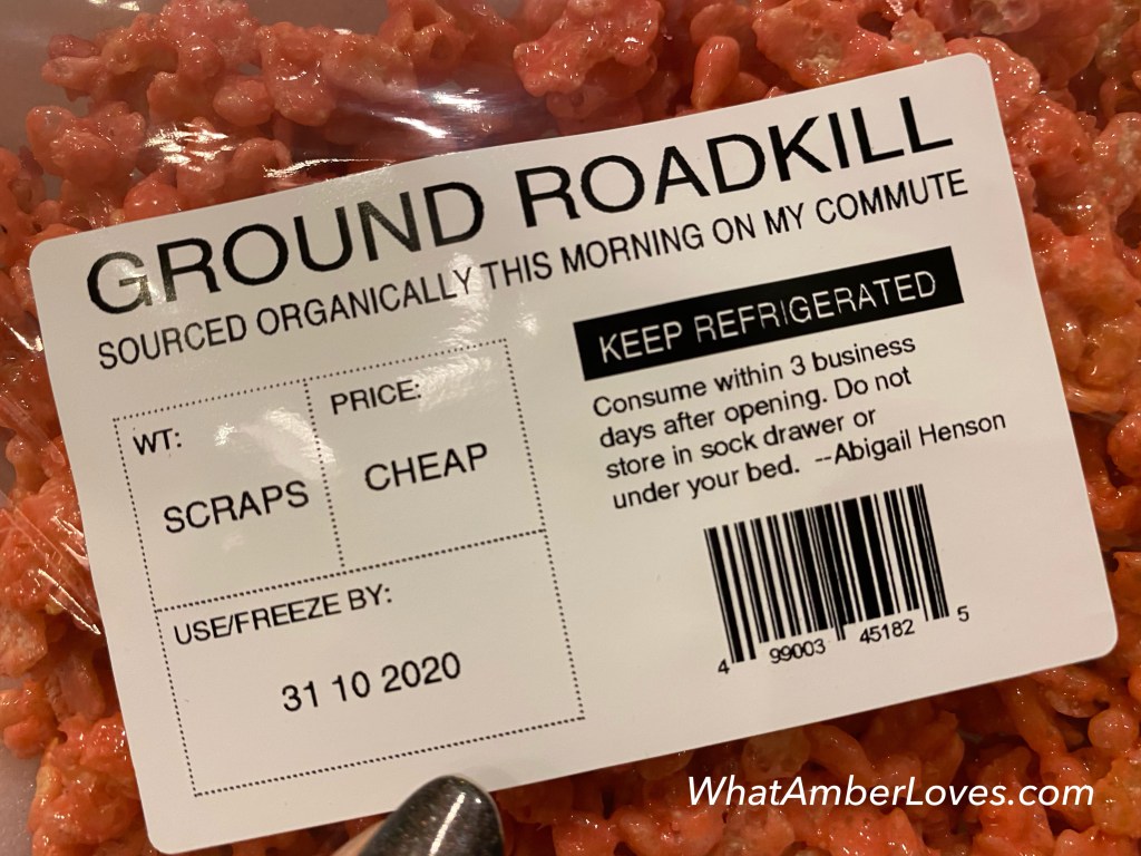 Using styrofoam trays, clear cling wrap, and custom printed labels, the treats suddenly transform in appearance from being a sticky sweet indulgence to an appearance of potentially rank (and definitely gross) ROADKILL.