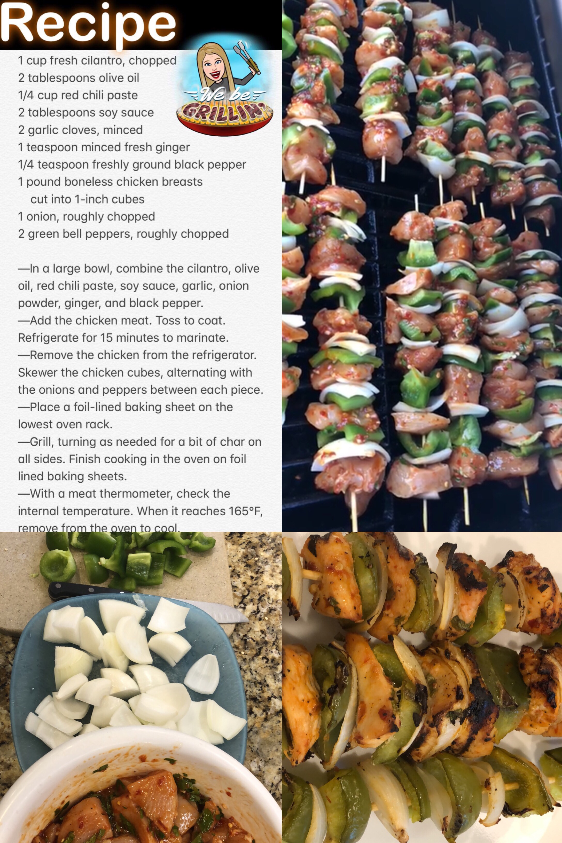 Cilantro and spicy chili come together on these tangy chicken skewers mixed with peppers and onions. Full of flavor from the fresh cilantro, this dish can be made by using the broil setting in your oven or over medium-high heat on the grill.