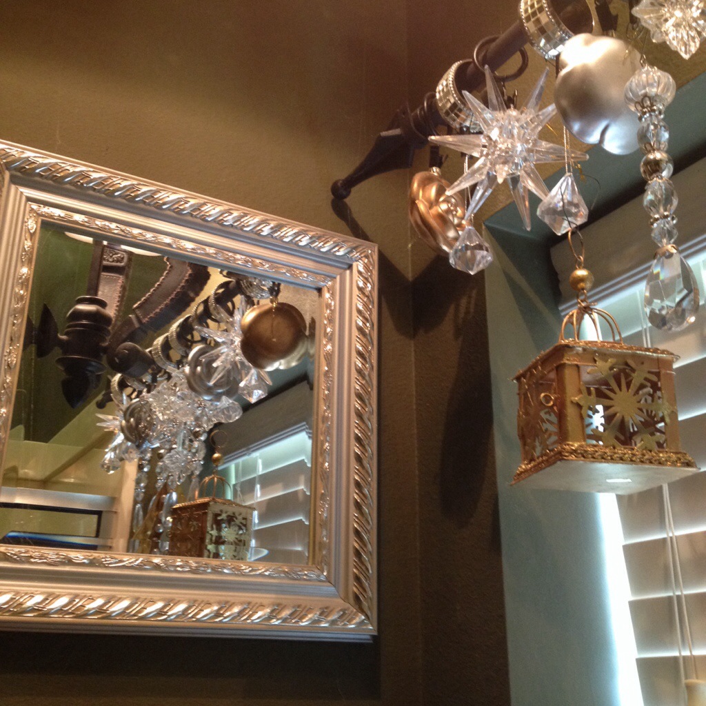 You and I are on the same page. We think hanging a bunch of sparkly ornaments on a curtain rod as a valance in a guest powder is a perfectly dandy form of window treatment! Yes, yes we do!