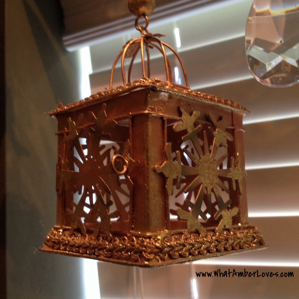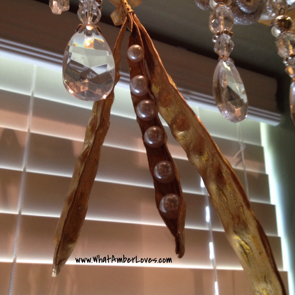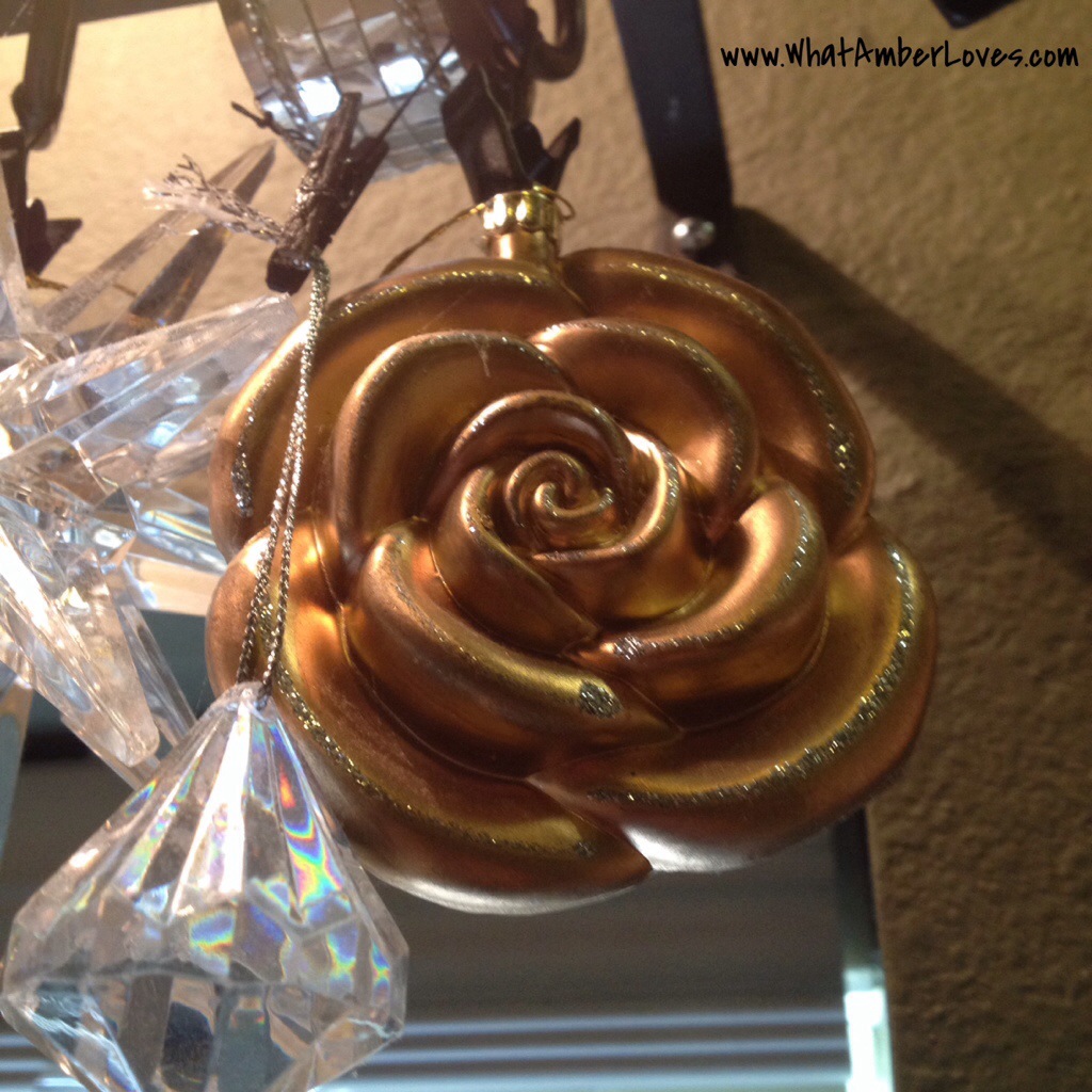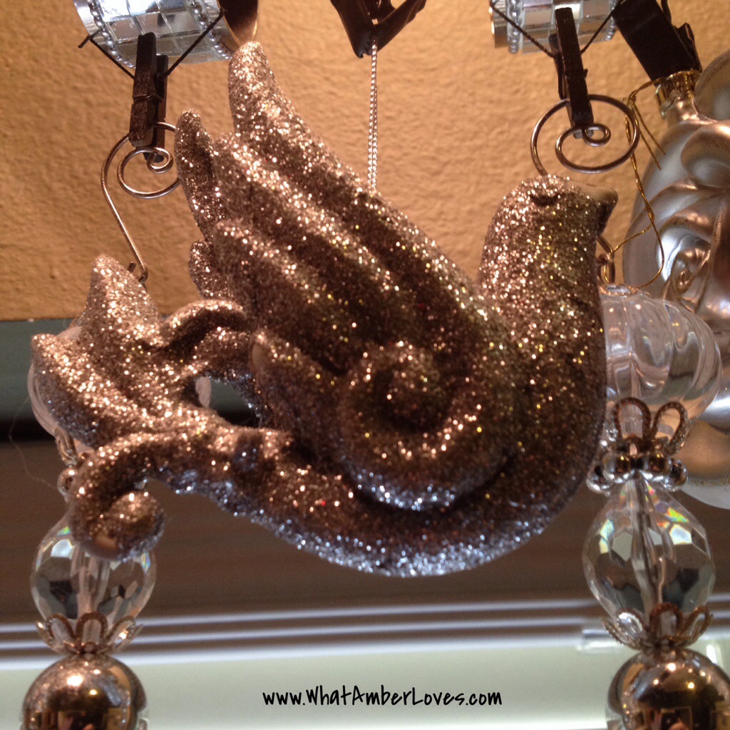 Which sort of ornaments did I choose for said valance? Well, the most fun and sparkliest ones, of course! Roses, glitter coated birds, bird cages, golden sweet pea pods with pearls of peas, crystal diamonds, and more!