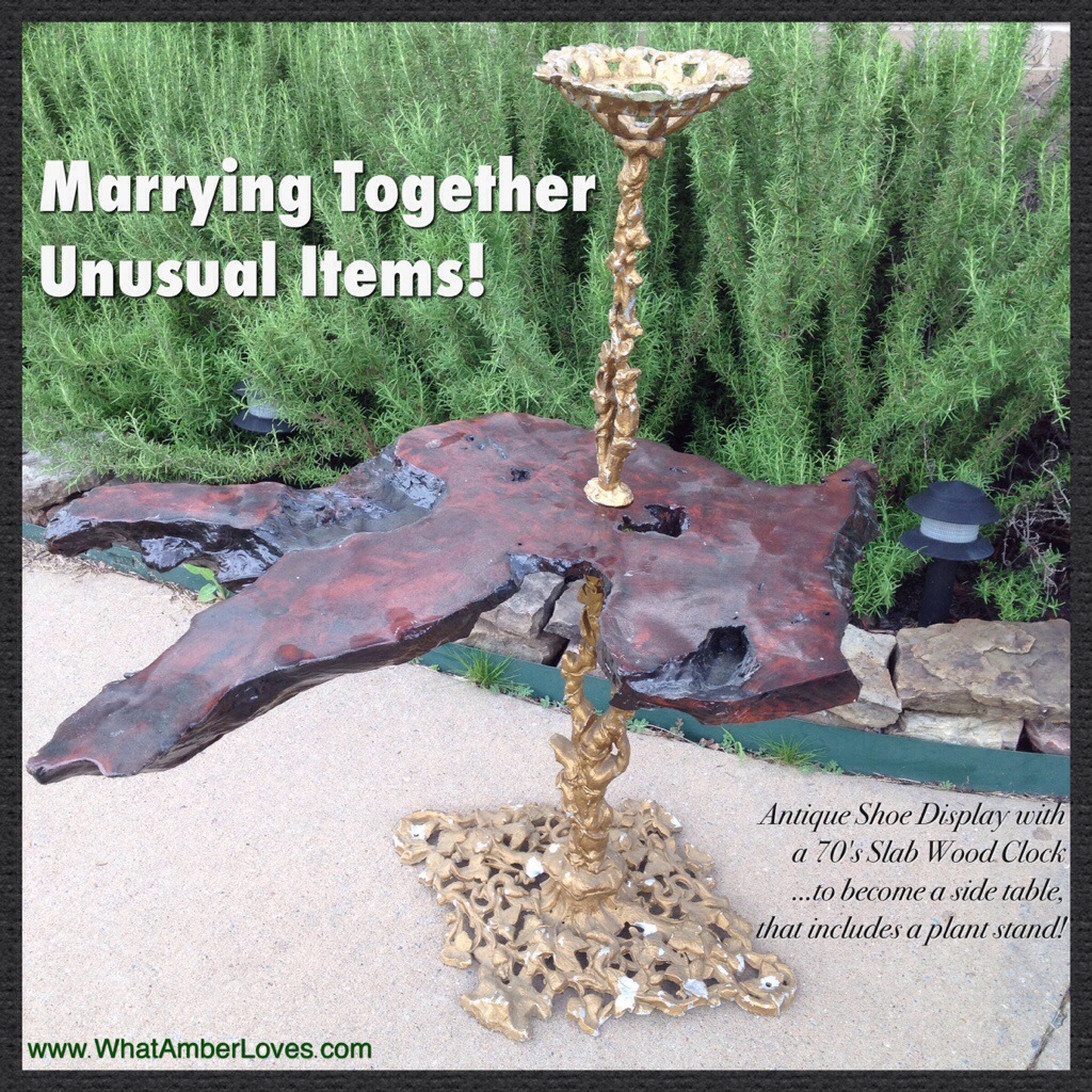 How about putting an Antique Shoe Display Table together with a 70’s Slab Wood Clock, so that it is a new piece of furniture? Well, we did just that. Now, we have a side table that includes a plant stand!