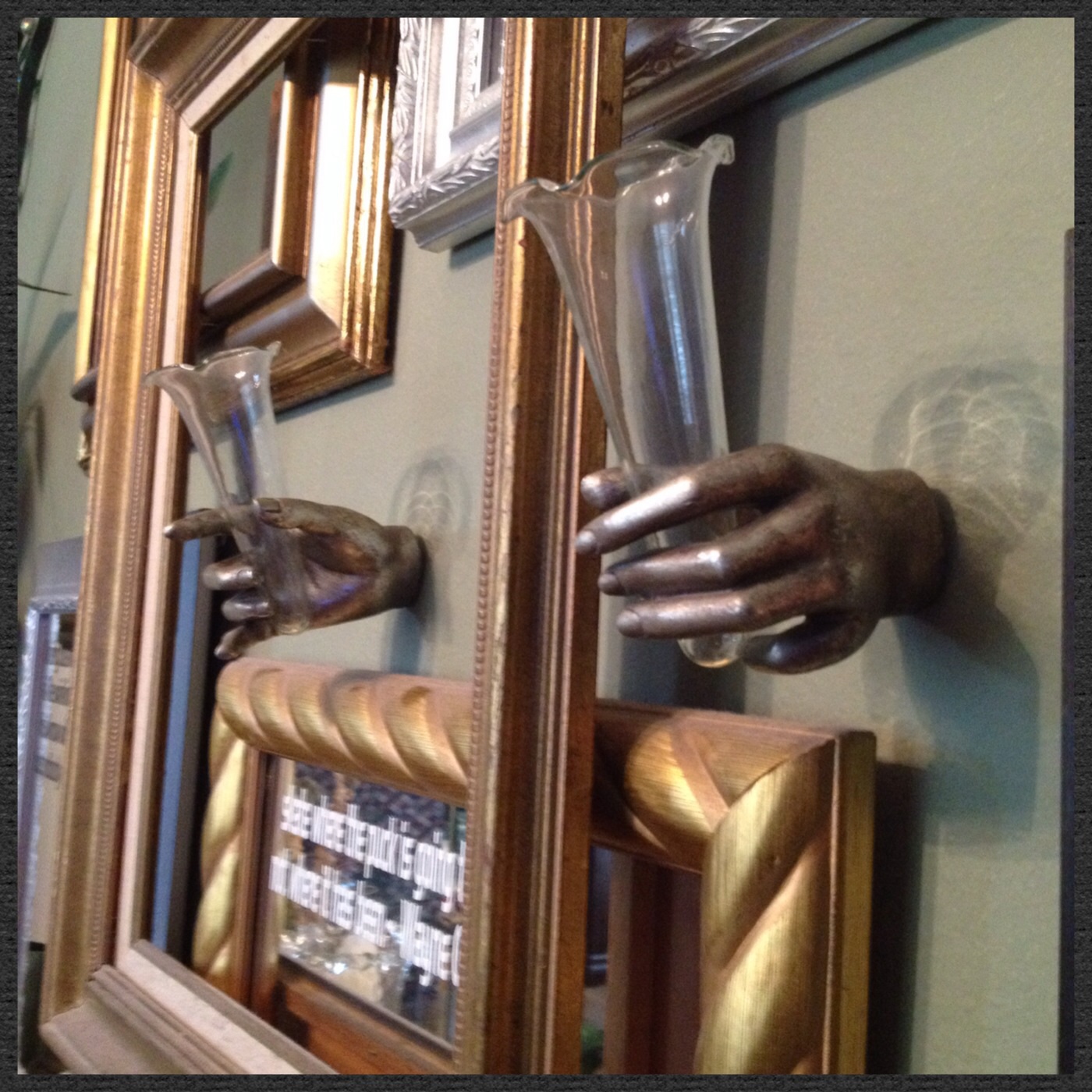 I picked up the gilded, cast aluminum(?) table-ish piece at an estate sale. The resident of the house told me it was salvaged from on old shoe store that closed and was eventually torn down in town decades ago. The same weekend, I bought a piece of slab wood that has a high gloss finish. It had a hole drilled in the center and an area routed in the back indicating it had once been used as a large clock. 1970’s style?